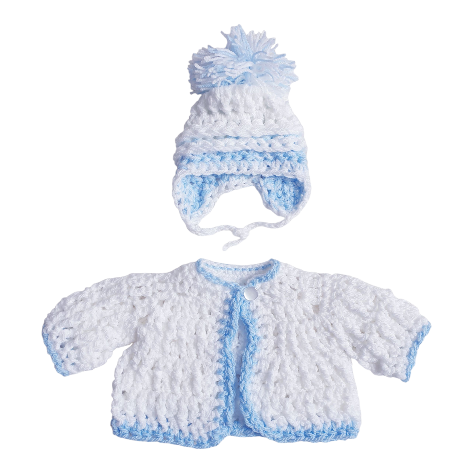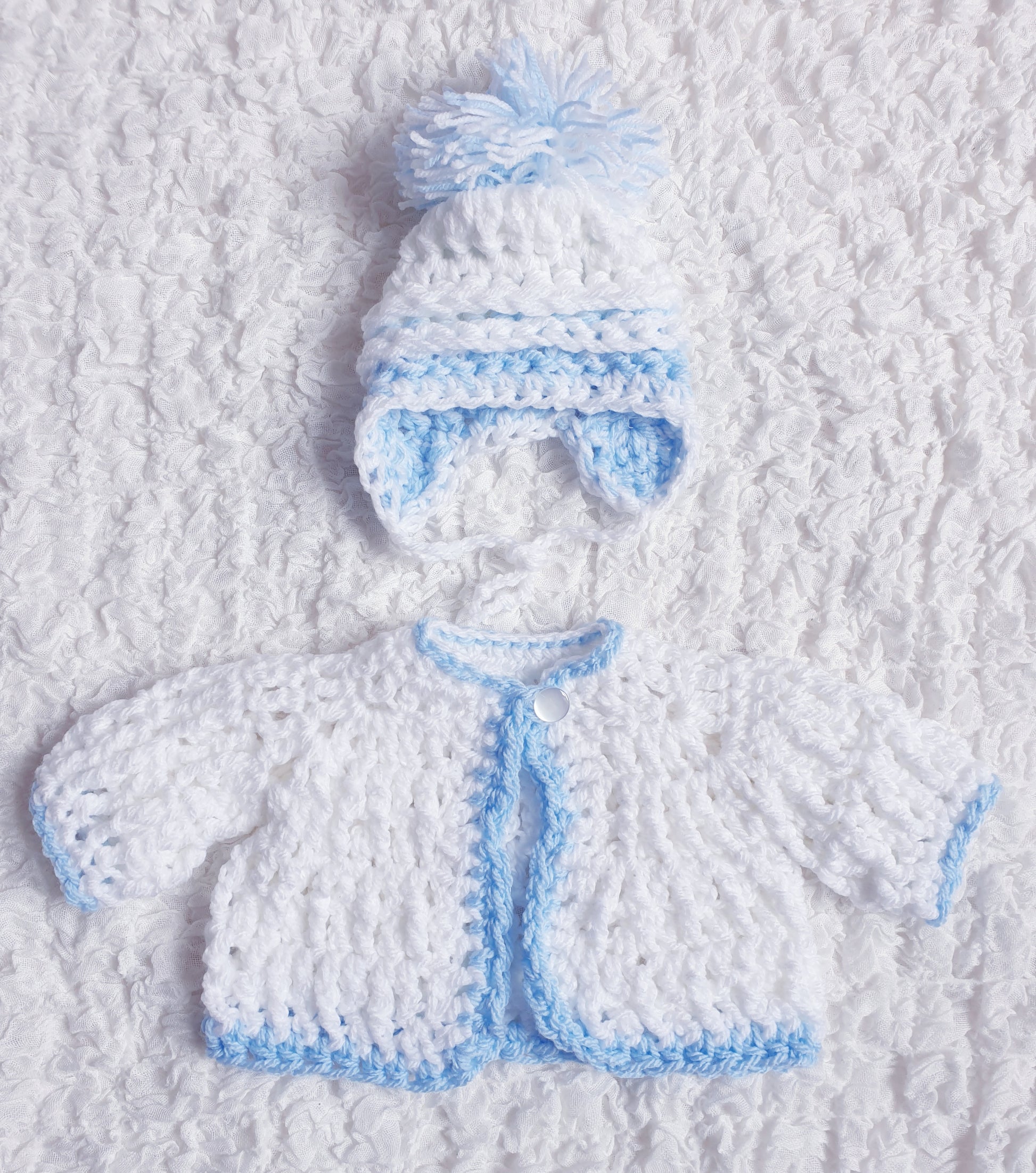 Baby boys white/blue hand knitted cardigan and pom pom hat