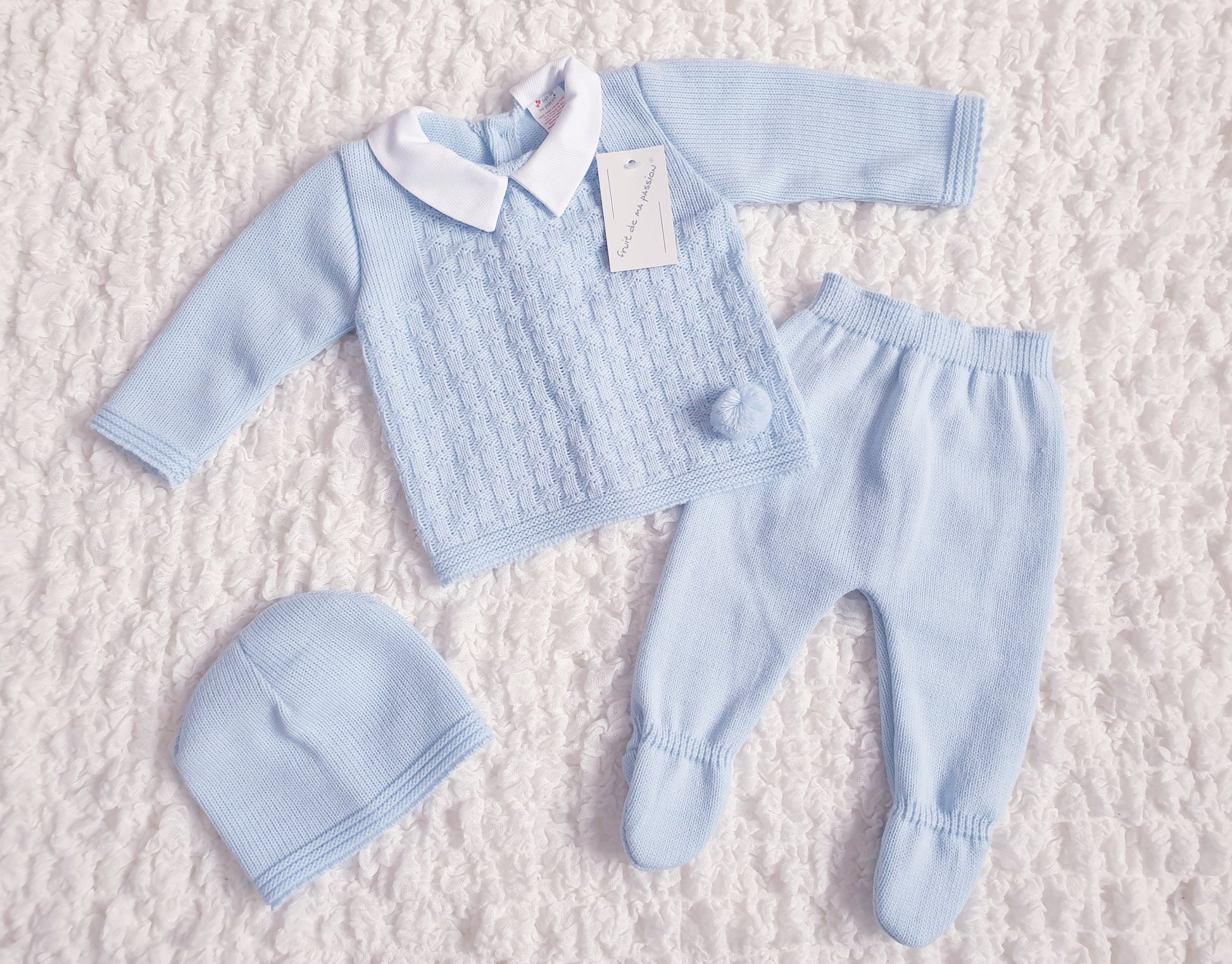 Baby boys blue Spanish knitted 3 piece set with pom pom detail
