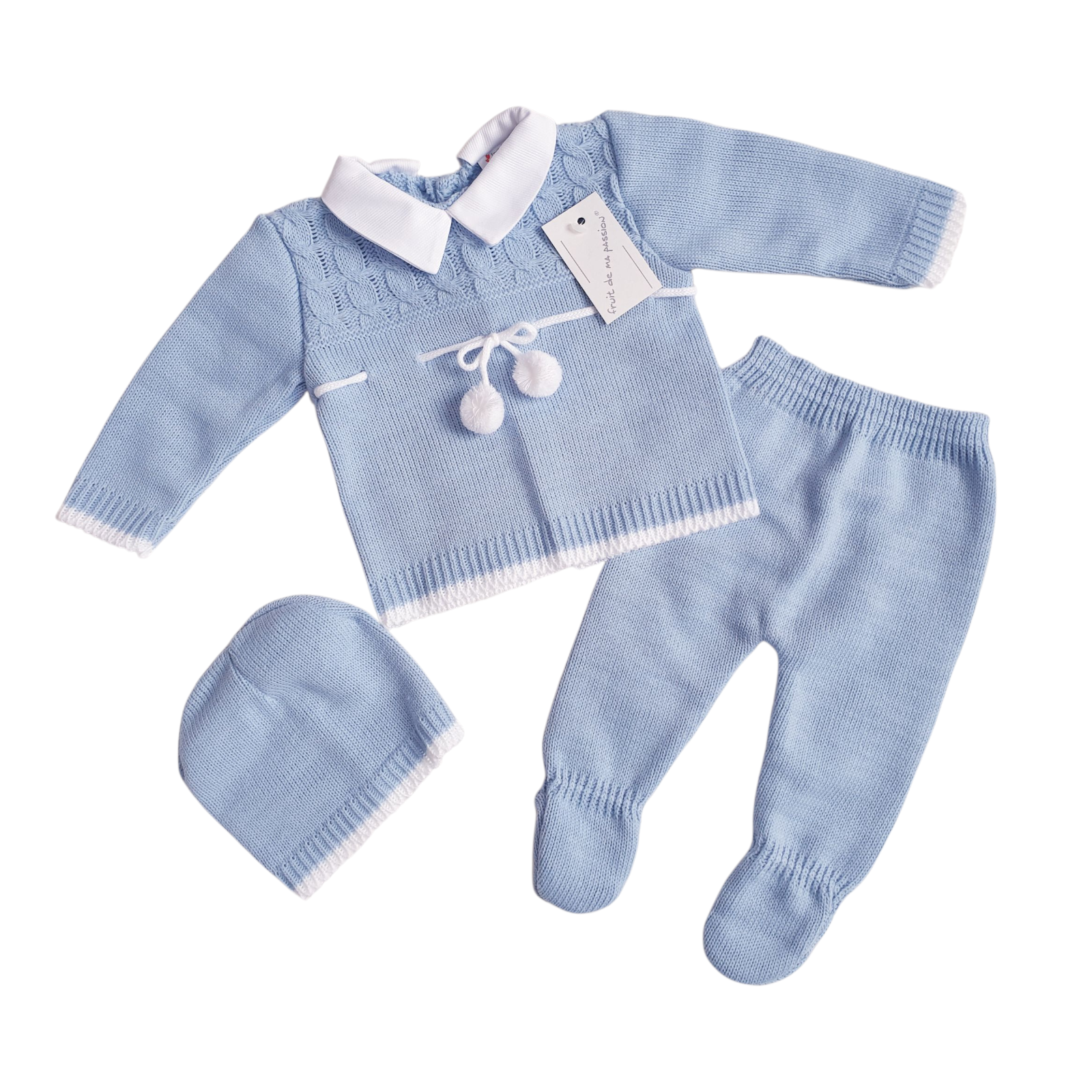 Baby boys blue Spanish knitted 3 piece set with pom pom detail