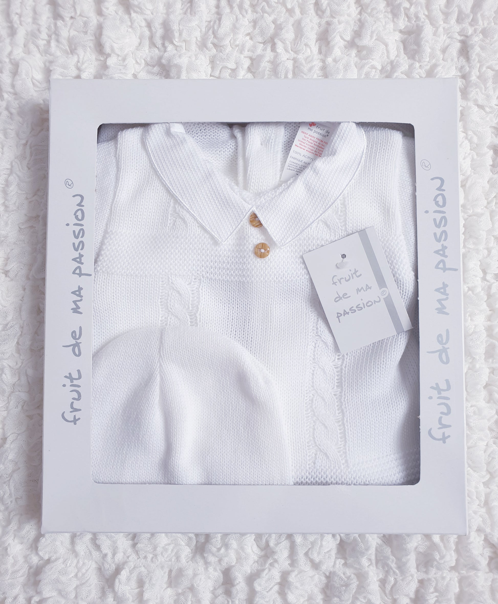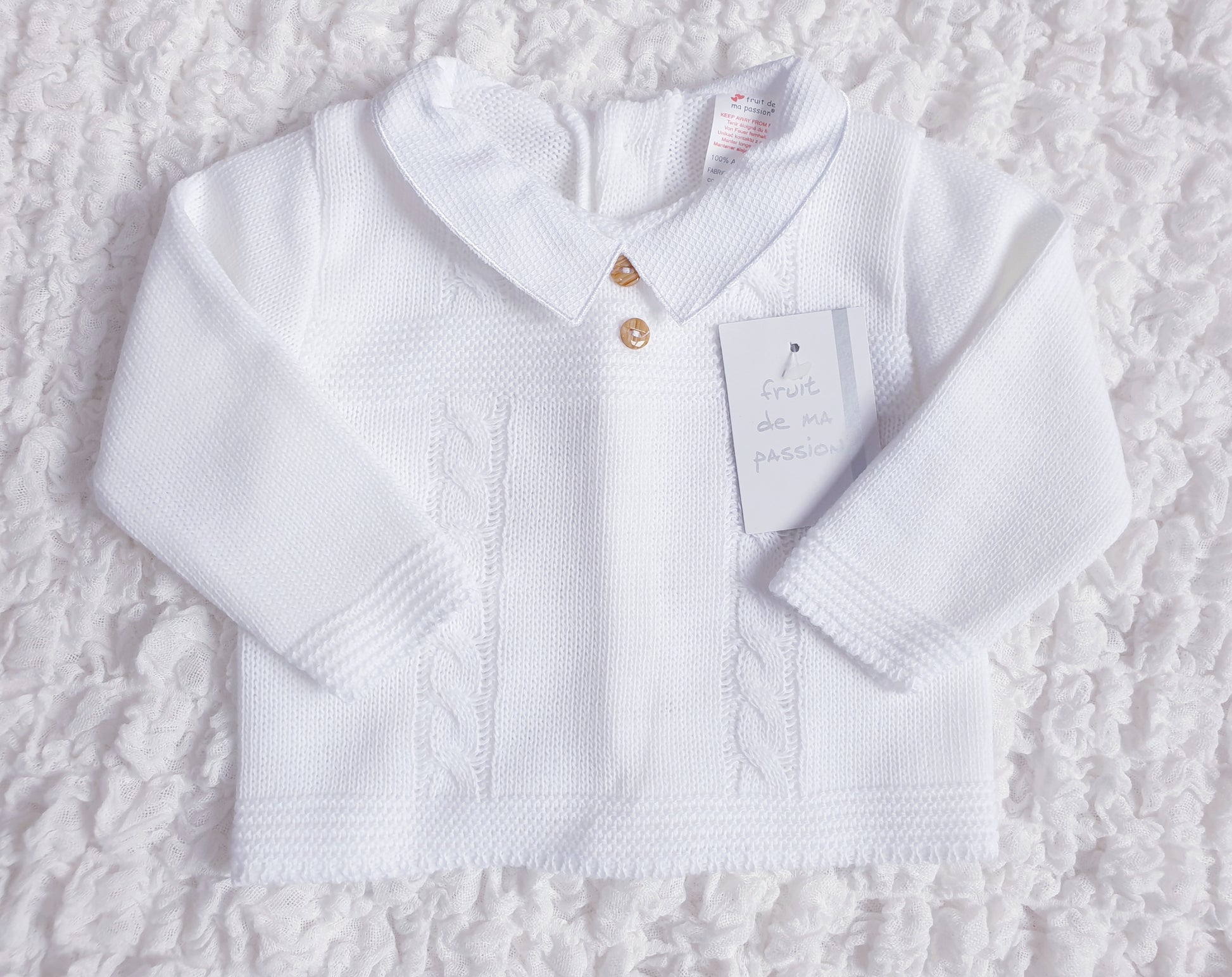 Baby boys white Spanish knitted 3 piece set with collar and button detail