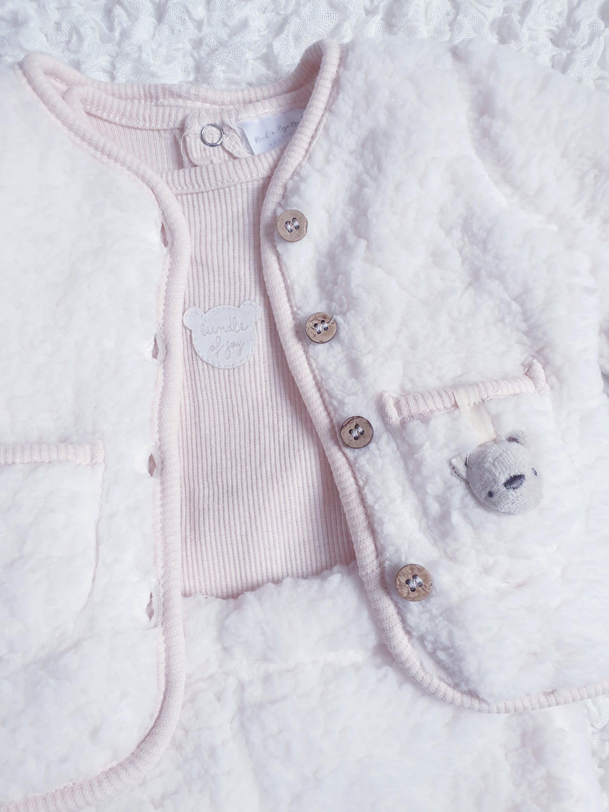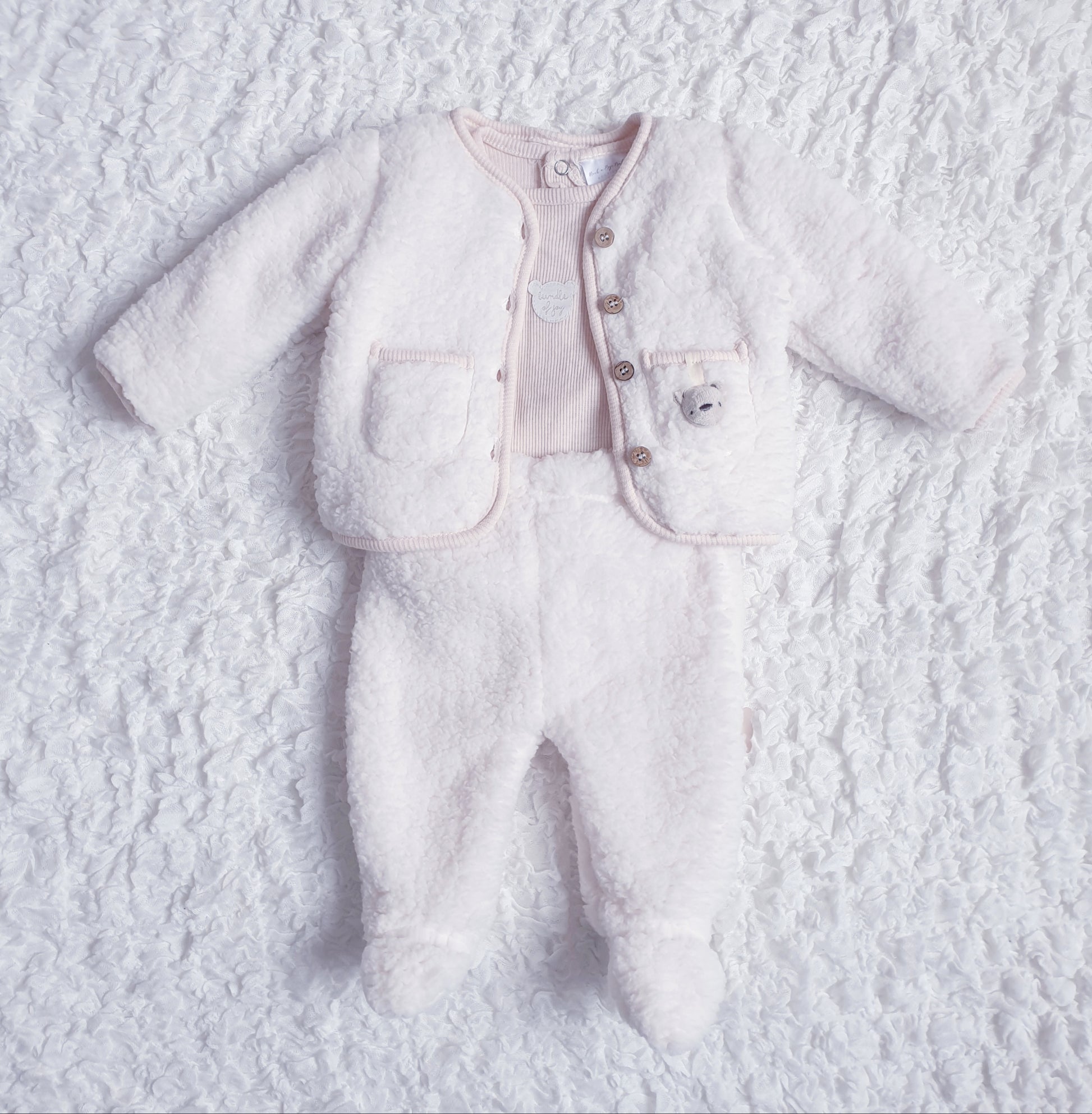 Baby cream cosy sherpa fleece teddy jacket, long sleeve body suit and matching trousers