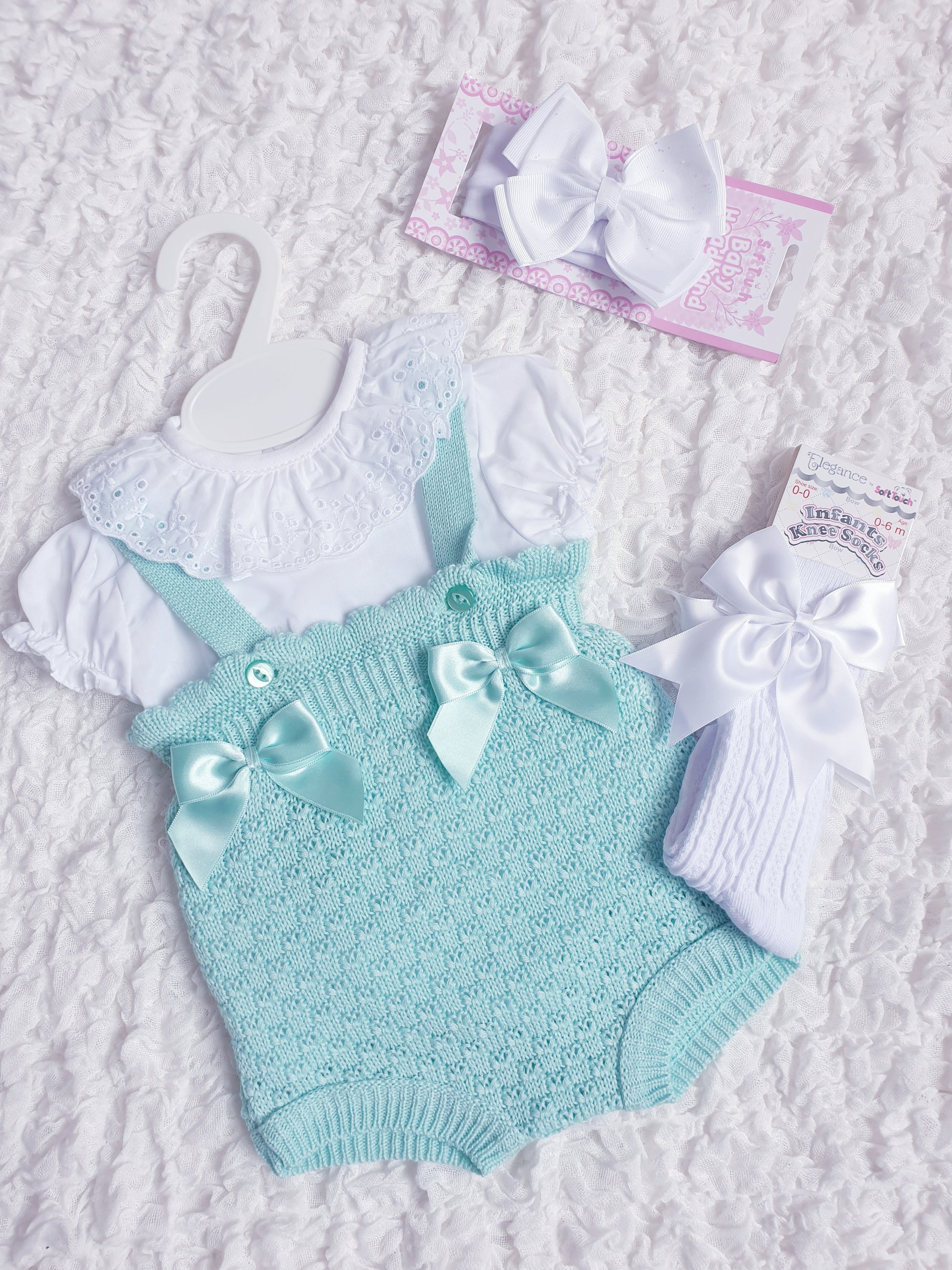 Baby girls Spanish knitted romper with 2 ribbon bows to the front and frilly collar blouse available in pink or mint green