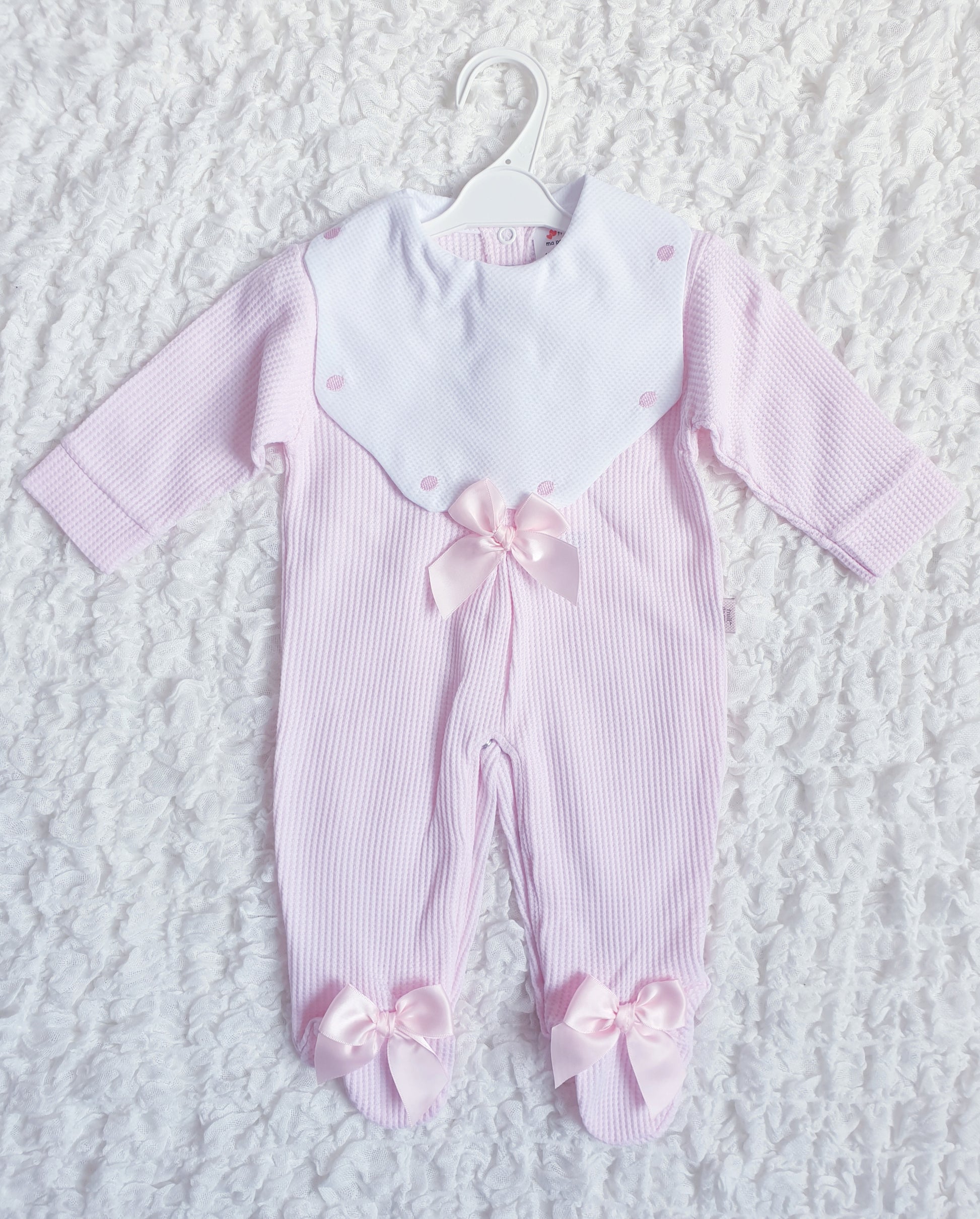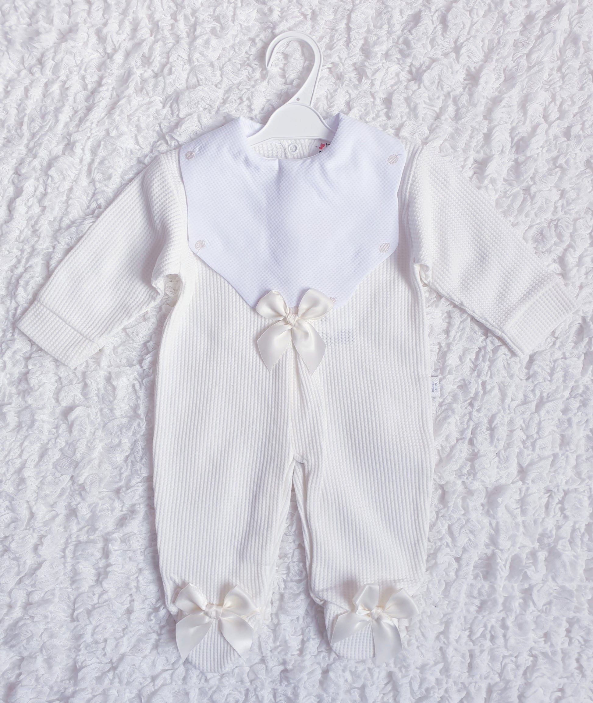 Baby girls Spanish ribbon bow babygrow available in pink or cream