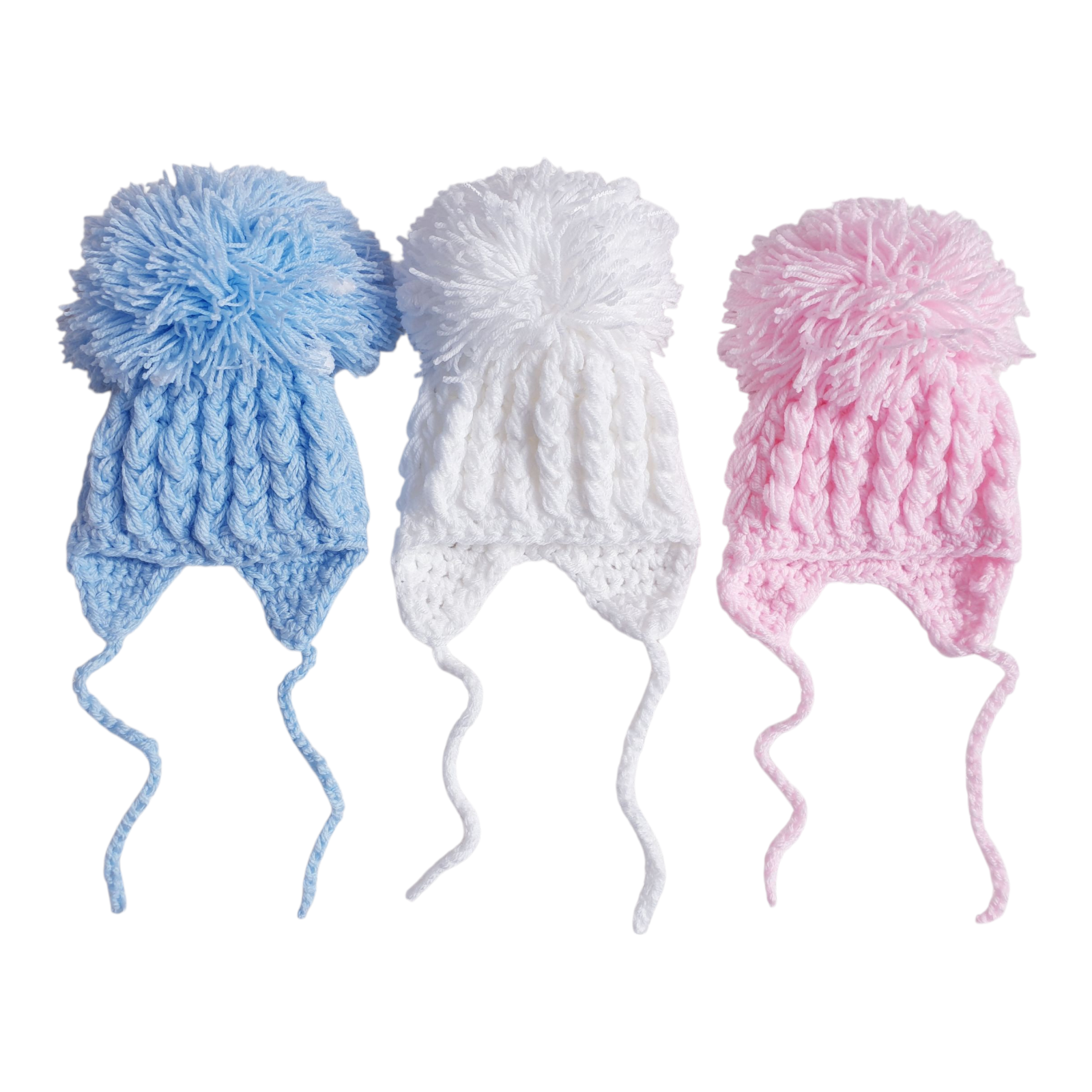 Baby girls/boys hand knitted pom pom hat with ties available in pink, blue and white