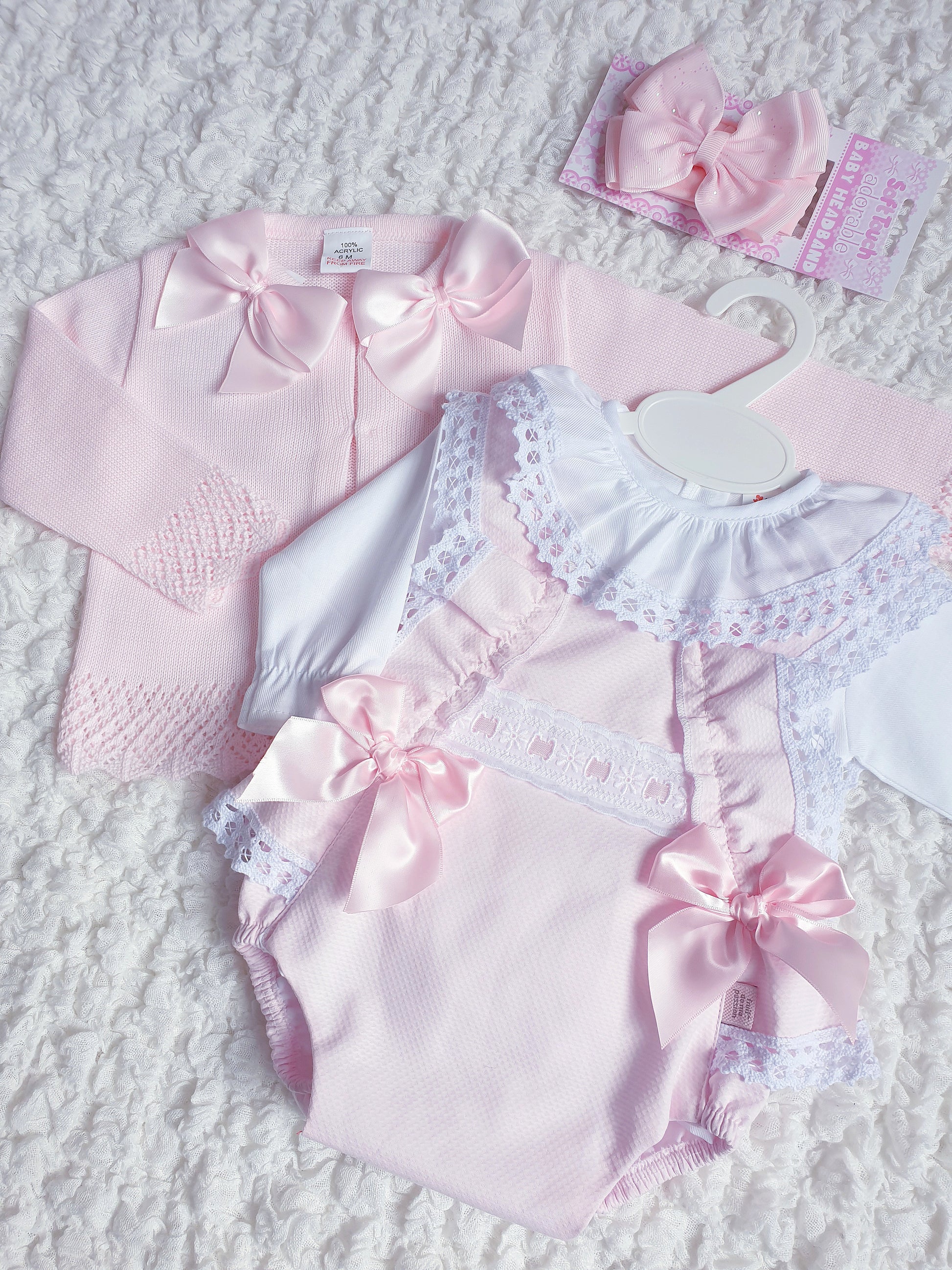 Baby girls Spanish pink frilly bum romper with 2 ribbon bows to the front with matching frilly collar blouse