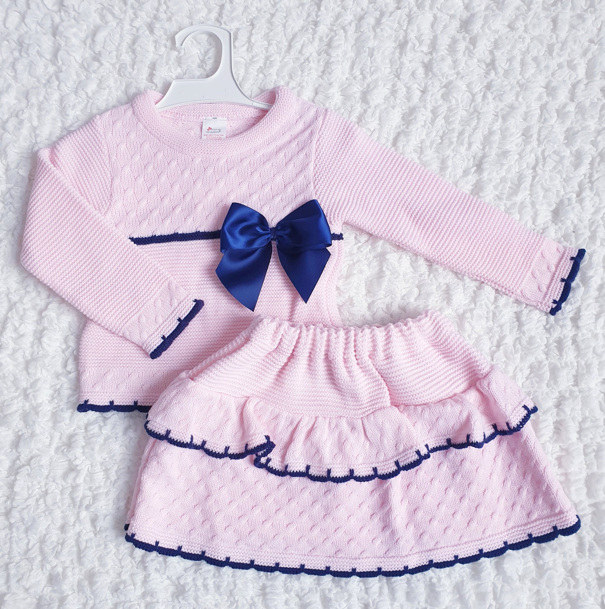 Girls Spanish pink/navy knitted skirt set with navy ribbon bow to the front and frilly detail