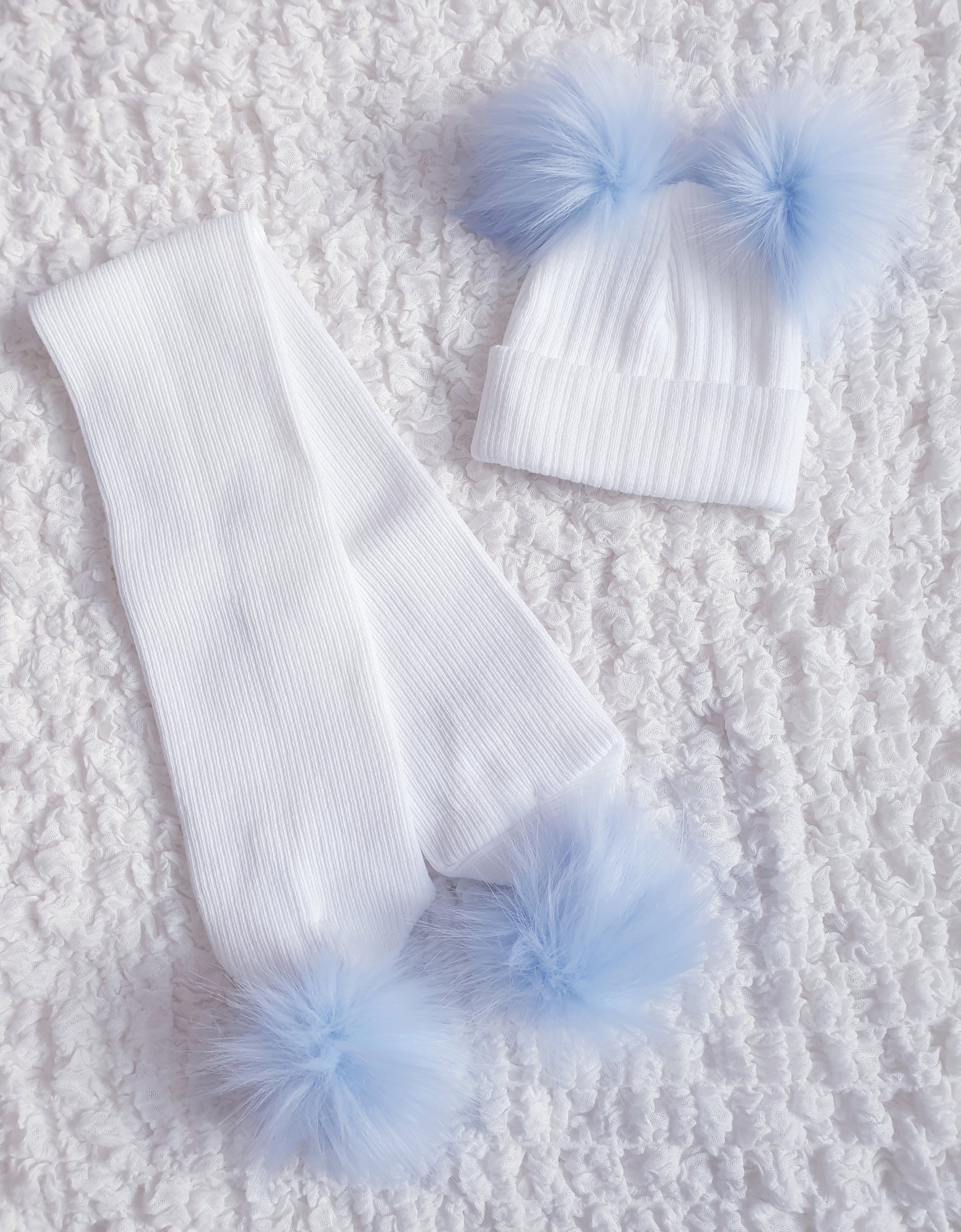 White/Blue Faux Fur Double Pom Hat & Scarf (sold separately)